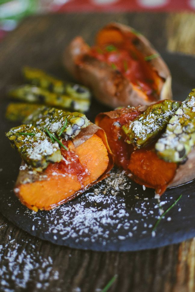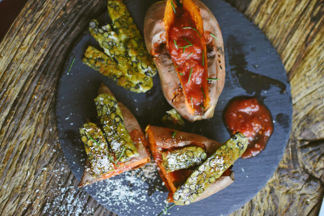 - Cut the sweet potato and fill it with tomato sauce and top with baked tempeh. Sprinkle with some coconut if you want to.